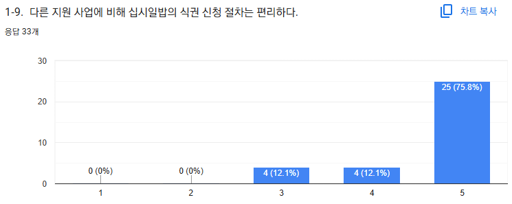 기타 지원 사업과 비교했을 때 십시일밥만의 차별점은 무엇이었을까요? 이번 소셜임팩트 설문조사를 통해, 십시일밥의 노력에 대해 청년들은 매우 긍정적인 평가를 보내주셨습니다! 그중 신청 절차의 편의성에 대해서는 75.8%의 응답자가 만점인 5점을 주셨고, 24.2%가 3~4점을 주시며 응답자 전원이 전반적으로 만족감을 표하셨습니다. 이는 다른 복지 사업들과 달리 복잡한 서류 제출이나 까다로운 절차를 덜어내고, 청년들이 필요한 도움을 빠르게 받을 수 있도록 심리적 문턱을 낮추기 위한 노력이 있었기에 가능한 결과였던 것 같습니다 ☺️