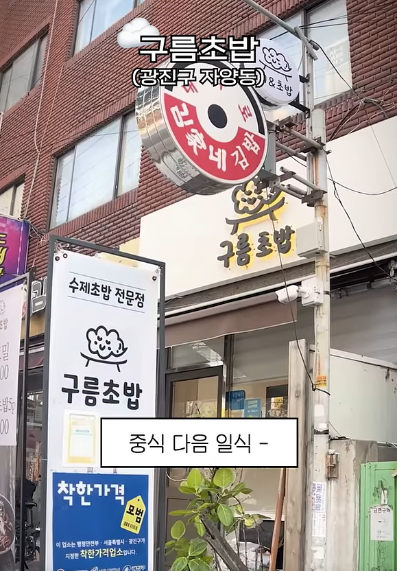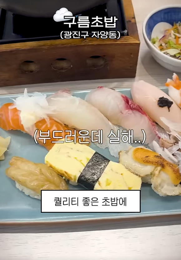 든든한 중식 뒤에 찾아온 두 번째 주인공은 뚝섬로에 위치한 ‘구름초밥’입니다. 일식은 비싸다는 편견이 무색하게, 이곳은 합리적인 가격으로 높은 퀄리티의 초밥을 선보입니다! 깔끔하고 쾌적한 내부로 들어서면 부드러우면서도 실한 초밥이 우리를 반겨주는데요😋