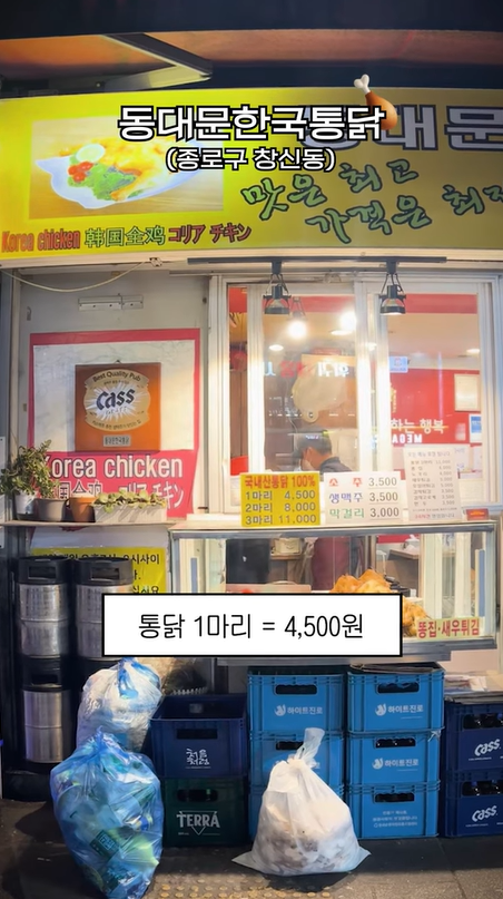 동대문역에서 단 1분 거리에 위치한 ‘동대문한국통닭’입니다. 2026년이라는 숫자가 무색하게 이곳의 통닭 한 마리 가격은 무려 4,500원입니다. 요즘 프랜차이즈 치킨 한 마리가 3만 원대에 육박하는 현실을 생각하면, 이곳은 그야말로 ‘가성비의 성지’라고 불릴 만한 것 같은데요! 이 때문인지, 저희가 방문했을 때도 이미 매장 안은 빈자리 하나 없이 만석이었다고 합니다 😅